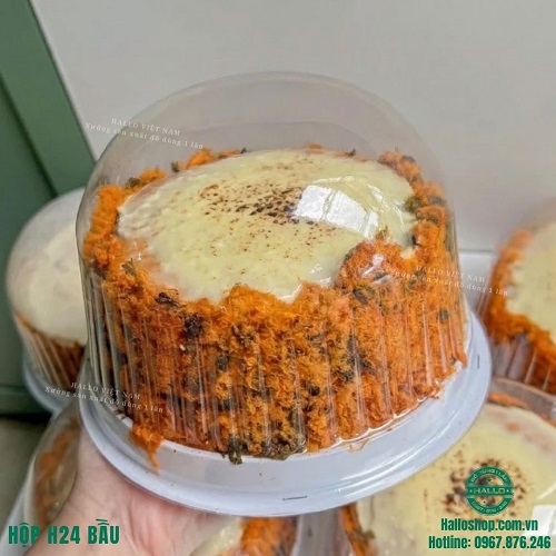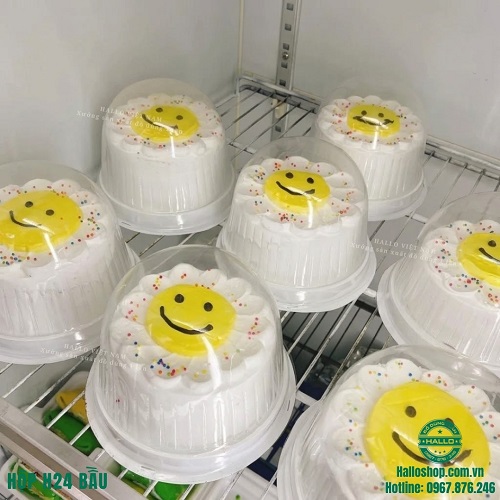Hộp nhựa H24 đế trắng nắp bầu là sản phẩm được sử dụng chủ yếu để đựng bánh crepe sầu riêng size lớn, bánh bông lan trứng muối, bánh đào tiên, bánh kem, bánh đồng tiền trong lễ Thần tài v.v. Thiết kế hộp trong suốt, chắc chắn vừa đảm bảo tính thẩm mỹ, vừa giúp bảo quản bánh sạch sẽ, an toàn khi trưng bày và vận chuyển.