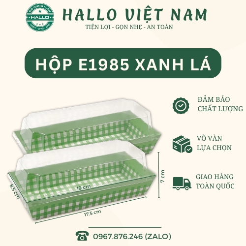- Hộp bánh E1985 caro xanh lá có lớp nhựa trong suốt tăng thẩm mỹ cho bánh, khiến bánh trở nên đẹp và bày trí gọn gàng.