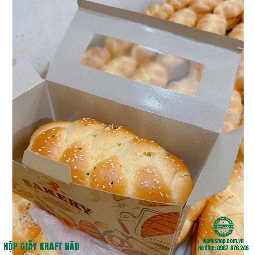 Hộp giấy kraft nâu là sản phẩm được sử dụng để đựng bánh mì hoa cúc, bánh mì phô mai, bánh mì sourdough. Với thiết kế phong cách cổ điển, chất liệu giấy kraft dày dặn, chiếc hộp này vừa có thể bảo quản tốt chất lượng bánh, vừa tạo ấn tượng, bắt mắt khi trưng bày.