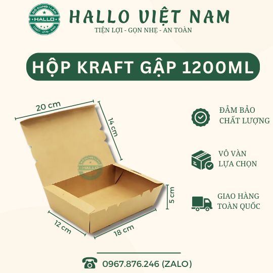 Kích thước Hộp giấy nắp gập kraft 1200ml : Dài : 20cm, Ngang : 14cm, Cao : 5cm