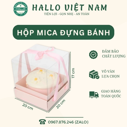 - Hộp quà mica đựng bánh có đáy: 20 cm x 20 cm với chiều cao 17 cm