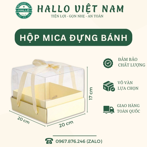 - Hộp quà mica đựng bánh có đáy: 20 cm x 20 cm với chiều cao 17 cm