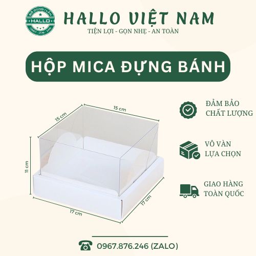 - Hộp quà mica đựng bánh có đáy: 17 cm x 17 cm với chiều cao 11 cm