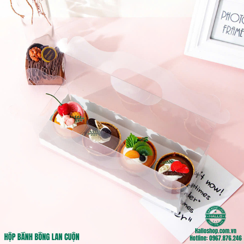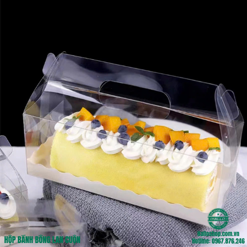 HỘP MICA TRONG SUỐT DÀI CÓ QUAI XÁCH là sản phẩm dùng để đựng bánh bông lan cuộn, cupcake, bánh ngọt các loại giúp cho sản phẩm của bạn luôn được bảo quản tốt, thơm ngon và đẹp mắt.