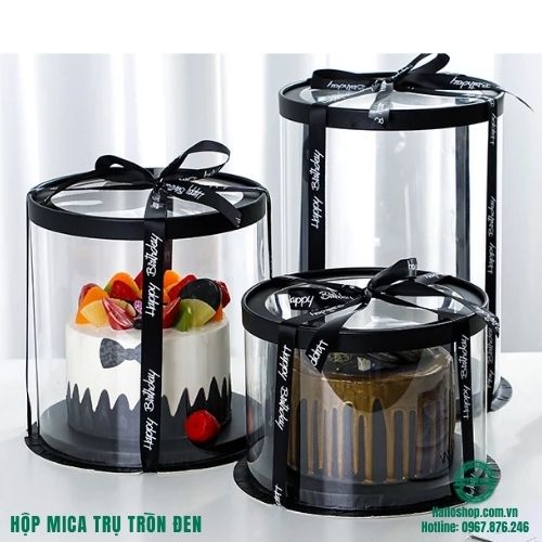 - Hộp mica trụ tròn đế đen đựng bánh kem