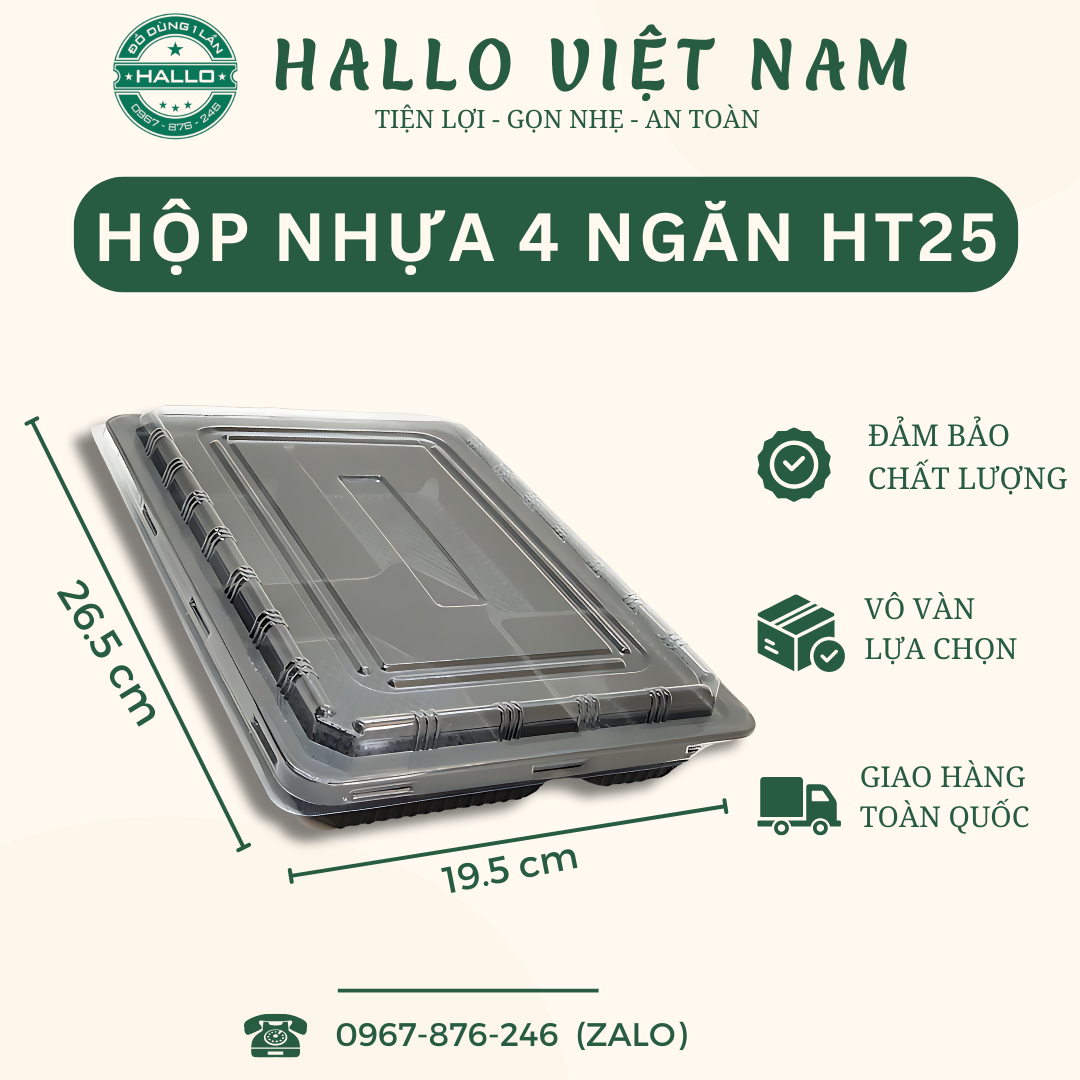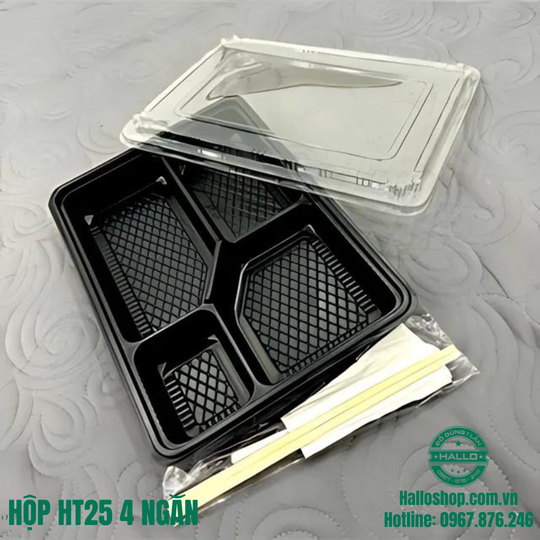 HỘP NHỰA 4 NGĂN ĐẾ ĐEN HT25 là sản phẩm dùng để đựng bánh, đựng cơm văn phòng, làm khẩu phần ăn giúp cho sản phẩm của bạn được bảo quản tốt, luôn thơm ngon, đẹp mắt.