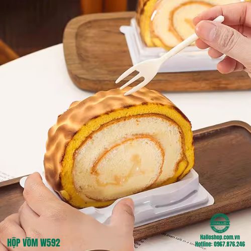 - Hộp bánh kèm nĩa W592 có lớp nhựa trong suốt tăng thẩm mỹ cho bánh, khiến bánh trở nên đẹp và bày trí gọn gàng.