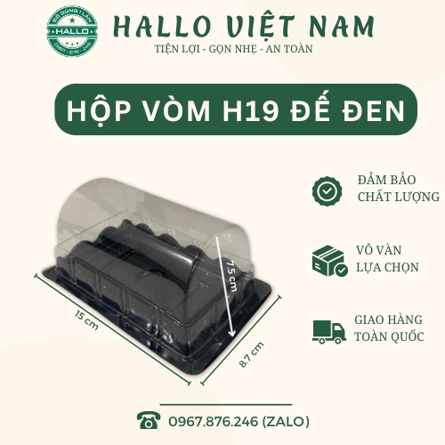 + Hộp nhựa vòm đế đen H19 có kích thước dài x rộng: 15 cm x 8.7 cm với chiều cao 7.5 cm