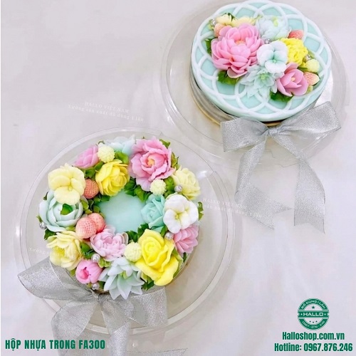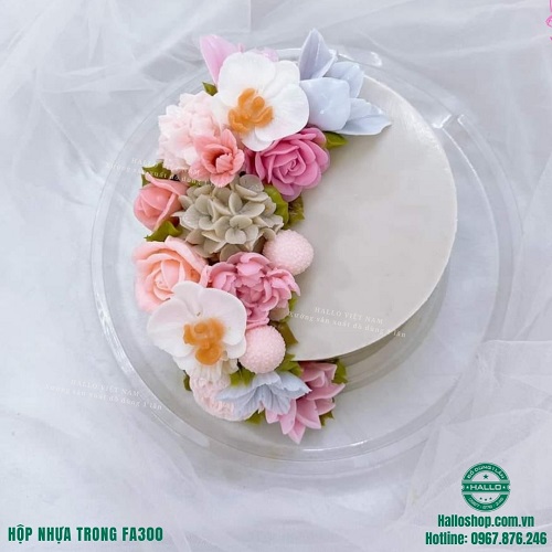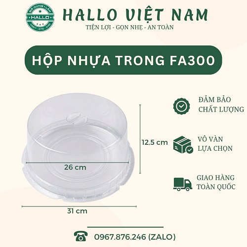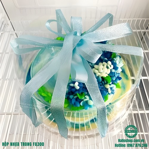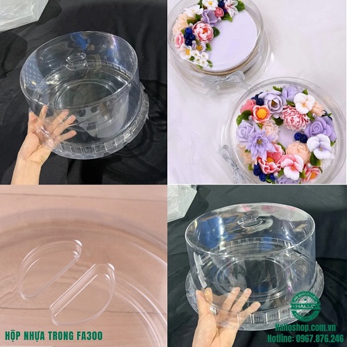 - Hộp nhựa trong FA300 sử dụng để đựng bánh kem, bánh sự kiện size lớn. Với kích thước cao 12.5 cm và rộng 26 cm, đây là dạng bao bì phù hợp cho các loại bánh kem lớn, sự kiện đông người. Đặc biệt, có thể trang trí thêm các phụ kiện thoải mái, tăng vẻ đẹp cho chiếc bánh.