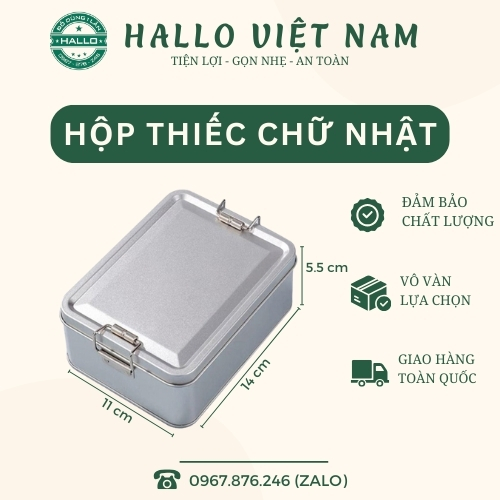 Kích thước: Hộp thiếc chữ nhật có đáy rộng x dài là 14 cm x 11 cm với chiều cao 5.5 cm