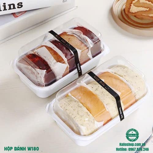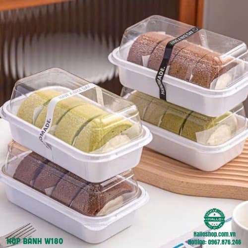 - Hộp nhựa đựng bánh W180 dùng để đựng bánh bông lan cuộn- Hộp nhựa đựng bánh W180 dùng để đựng bánh gato flan