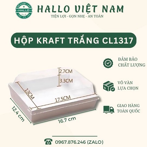 Khay giấy CL1317 màu trắng nắp trong đựng bánh được làm từ chất liệu giấy cao cấp, an toàn cho người sử dụng, thân thiện với môi trường, không gây hại tới sức khỏe. hộp giấy đựng bánh mì được tráng lớp PE giúp chống thấm nước, đựng được bánh nóng mà không làm ảnh hưởng đến chất lượng của đồ ăn.