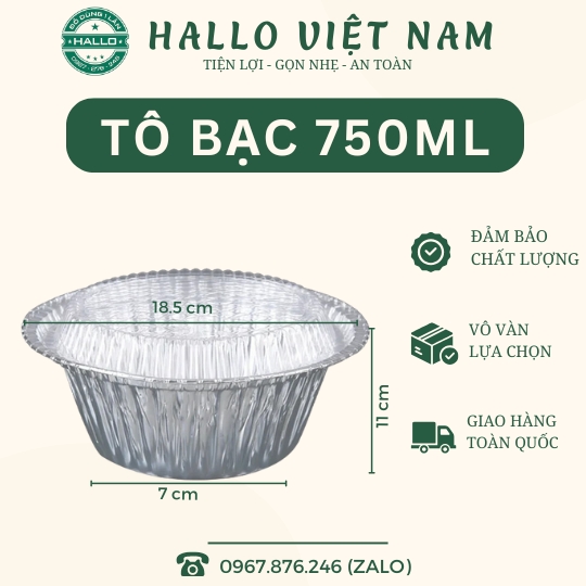 Kích thước Tô nhôm tròn 750ml : Miêng : 18.5cm, Đáy : 11cm, Cao : 7cm chưa tính nắp