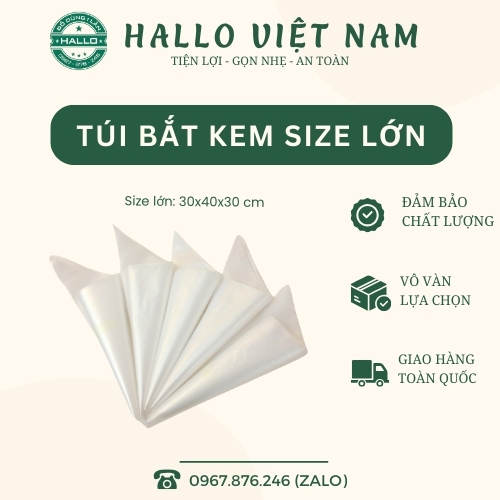 Túi bắt kem size lớn là dụng cụ không thể thiếu đối với những người làm bánh chuyên nghiệp cũng như các bạn yêu thích trang trí bánh tại nhà. Với thiết kế dạng tam giác tiện dụng và kích thước lớn 30×40×30 cm, sản phẩm mang đến sự thoải mái, chắc chắn và ổn định khi sử dụng, giúp tạo ra những đường kem sắc nét, mịn đẹp và đúng ý muốn.