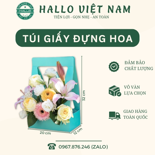 TÚI GIẤY XANH QUAI VUÔNG của là sản phẩm dùng để đựng bánh và hoa, cắm hoa, nước và hoa, phù hợp làm quà tặng cho người thân, người thương nhân dịp sinh nhật, ngày 8/3, dịp lễ.